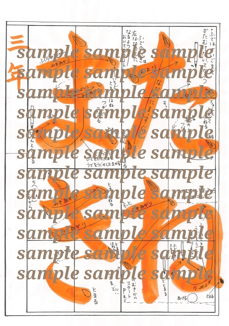 作者(揮毫者)の書道教室で使用している「こどもにもわかりやすく効率よく良い作品が仕上がる」と好評のお手本(pdf)です。活字より手書きの注釈がこどもたちに受け入れてもらいやすいようです。実物サイズお手本を横において見ながら書くことは良い作品の基本です。